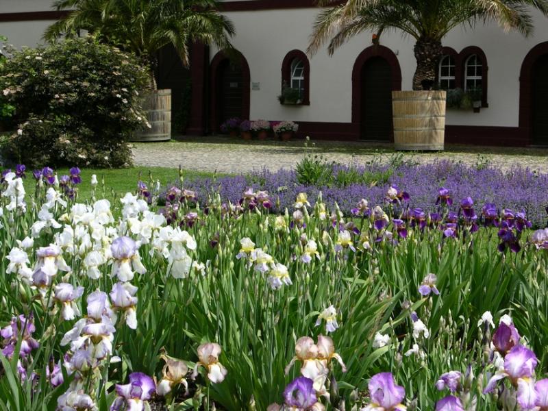 Auf der einen Seite des Irisfeldes erblickt man auch das schöne alte Wirschaftsgebäude (beherbergt heute ein Museum) …