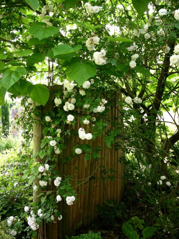 In the shadow garden the little rambler „Félicité et Perpétué“ is searching the light and the way up through the Catalpa bignonioides.