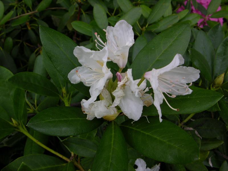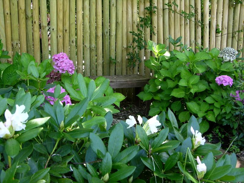 As in some other gardens too, the white rhododendrons near the little bench in the shadow, have opend their blooms.