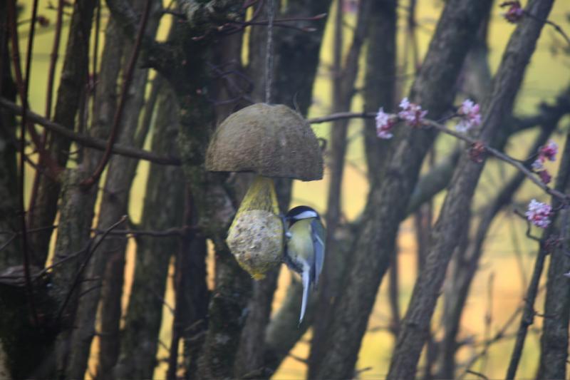 Through the window I can observe the birds on their feeding ball.
