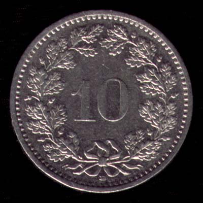 On this 10 Rappen coin you can see a wreath with common oak branches (Quercus robur). The oak tree has a great symbolic meaning since a long time.