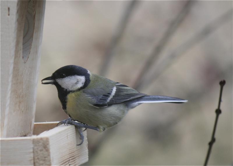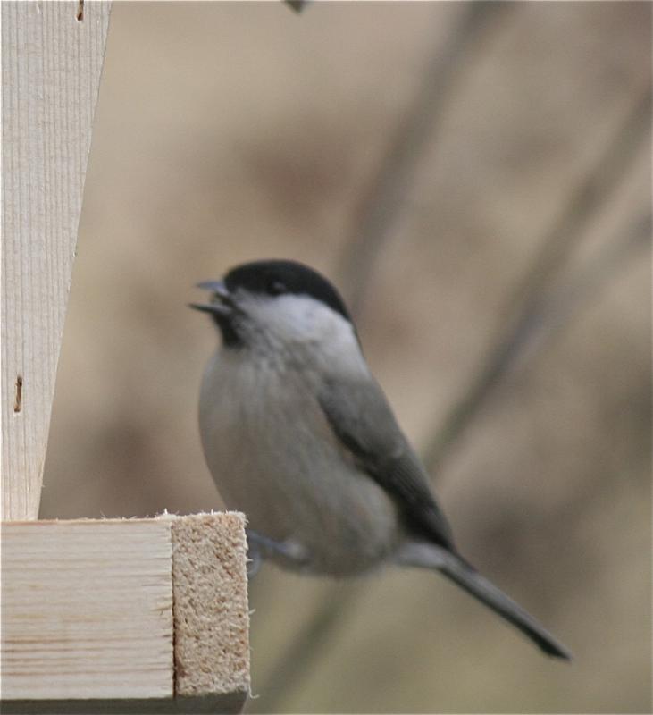 Unterdessen ist das Vogelhäuschen wieder besetzt. Diesmal von einer Tannenmeise (Parus ater), wenn ich mich nicht täusche. Leider ein unscharfes Bild.