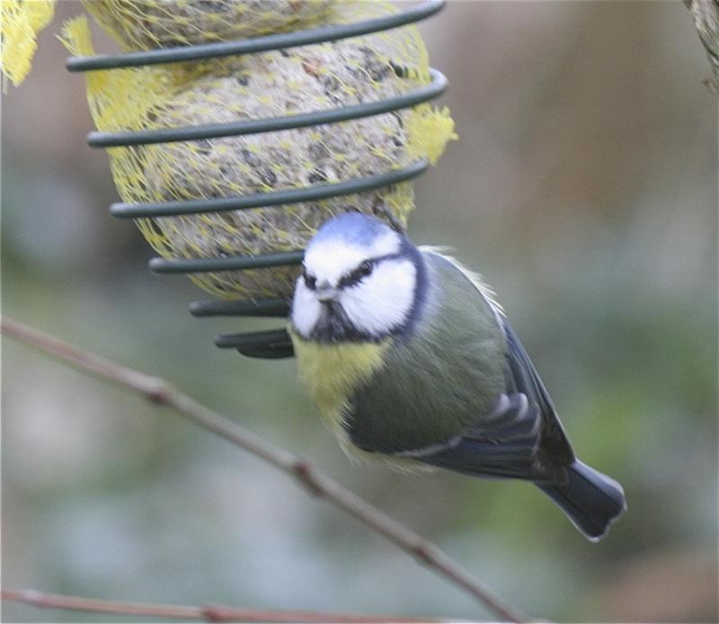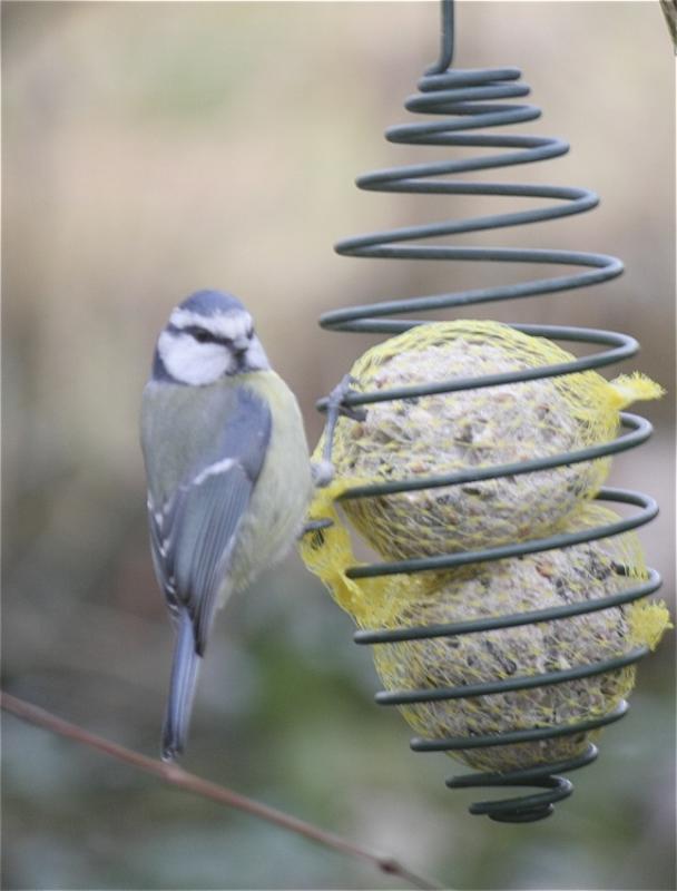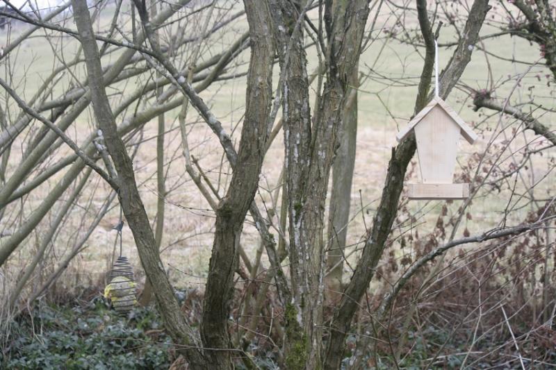 The bluetit (parus caeruleus) has an optimal view to the birdhouse as well as to the hanging feeders which contain little fat balls with a mixture of grains (especially for tits).