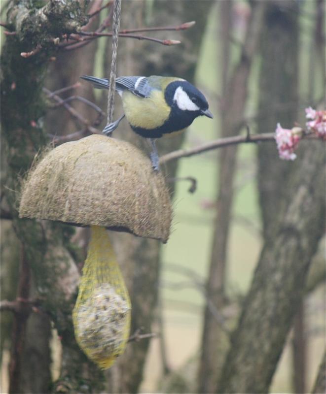 Diese andere Kohlmeise begnügt sich derweil mit dem kleinen Rest in der Kokosschale.