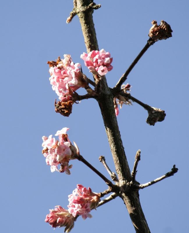 Viburnum bodnantense „Dawn“ fully bloomed.