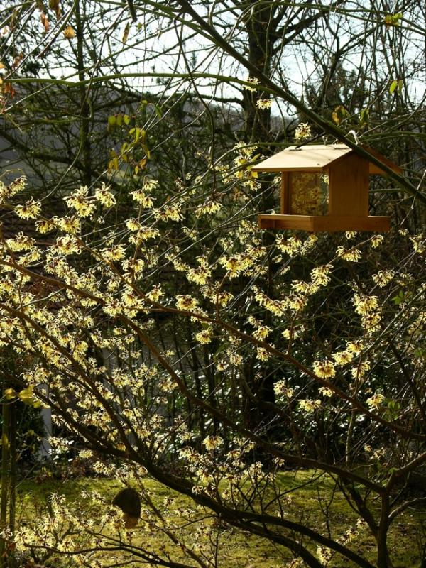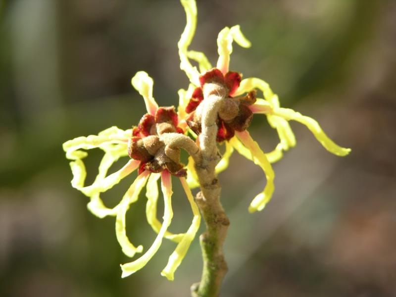 Our witchhazel (Hamamelis virginiana) bloomed within three weeks. This is always the first colour spot in winter.