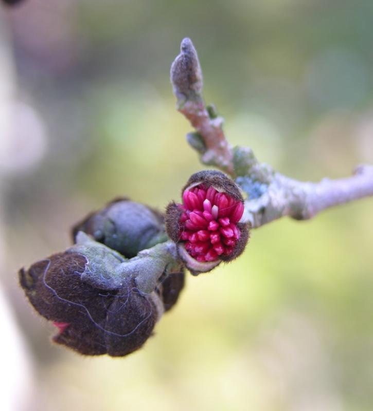 Die ersten winzigen Blüten des Amberbaumes (Liquidambar) werden wahrgenommen…..